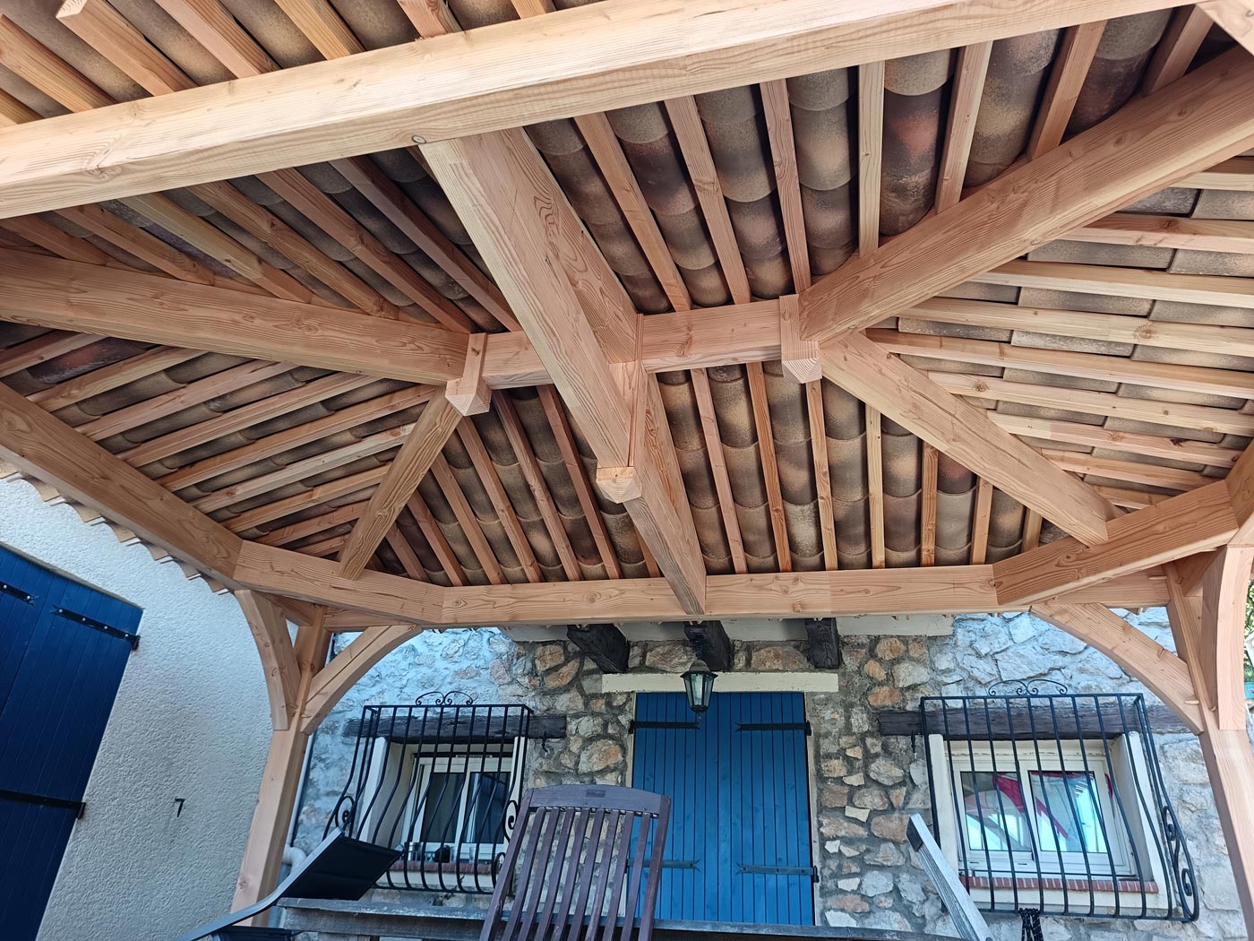 Charpentes en bois massif, construites selon des techniques artisanales et durables.